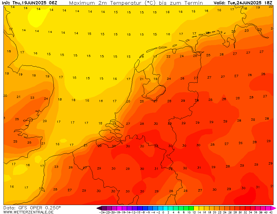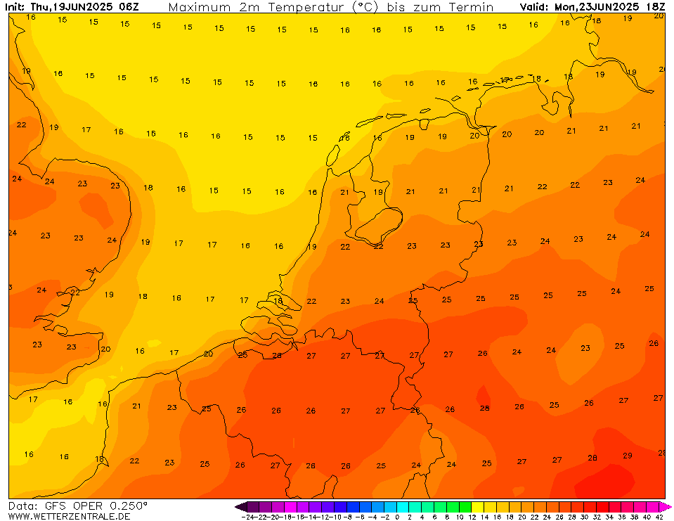 Oper GFS1906 - zaterdag 28-6 fors warm maar ook (stevige) buien?
