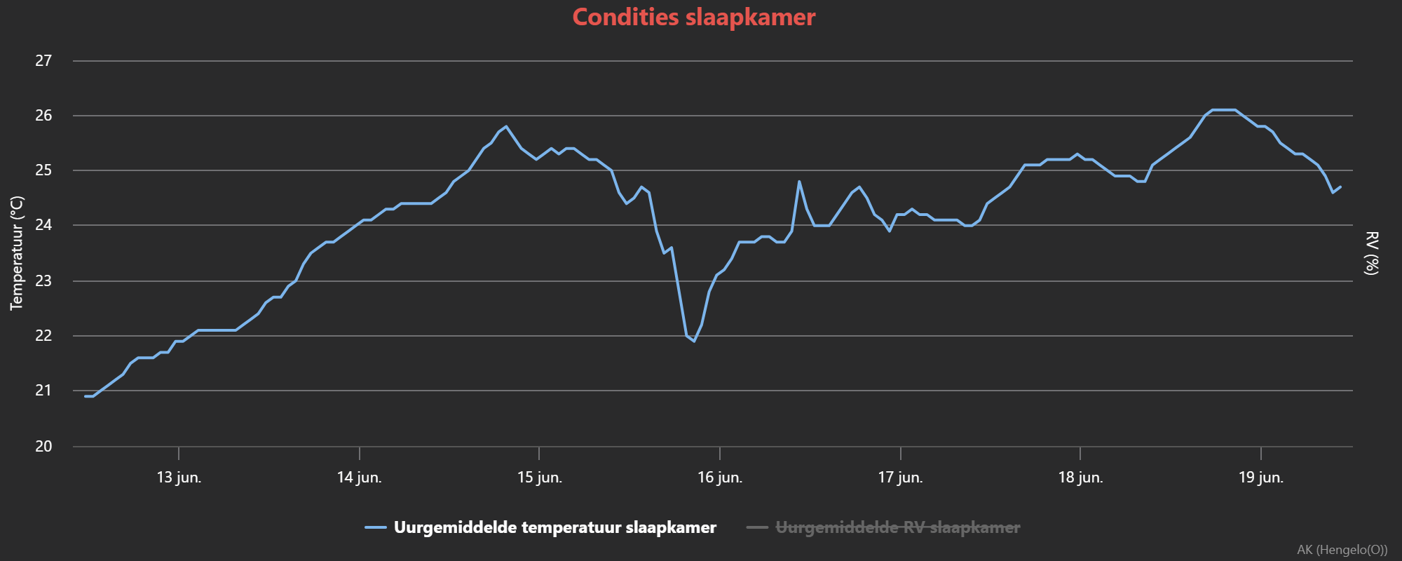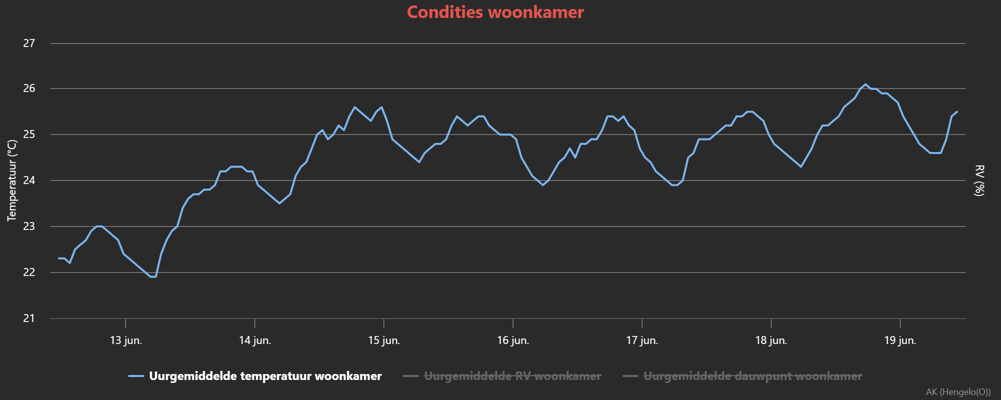 Werkkamer = 24c (airco aan) Woonkamer = 29c (airco uit)