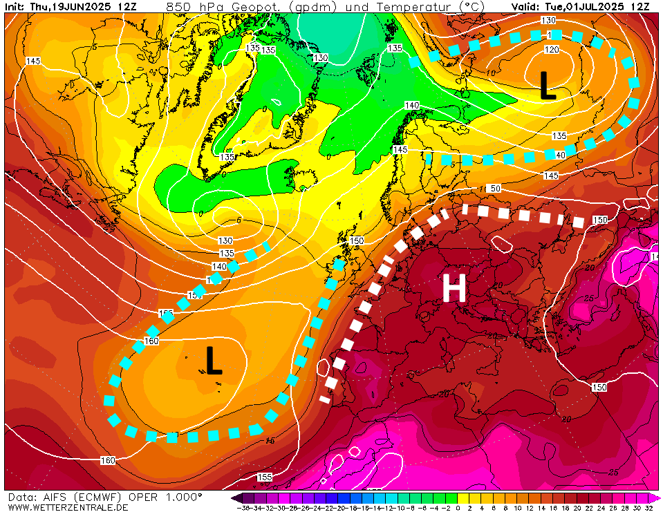 Zijn echt hete kaarten op termijn. Tussen twee hoogtetroggen in een grote continentale rug met een warmtepoel van Iberica tot Rusland. Met voortdurende subsidentie in zo'n hoog en veel zon warmt het alleen maar verder op en houdt de setting zichzelf in stand.