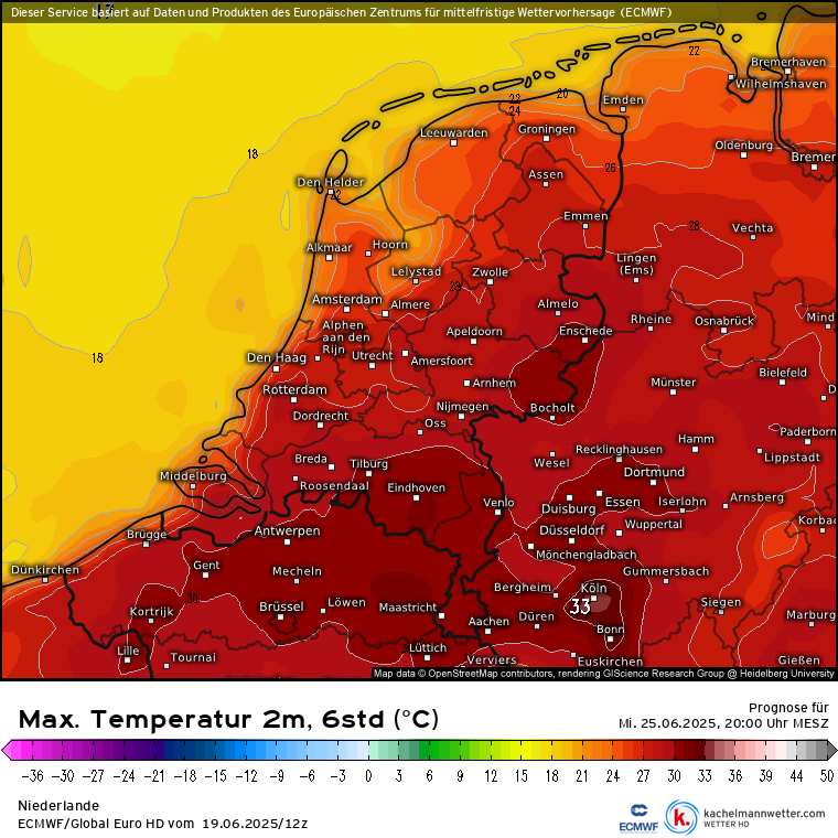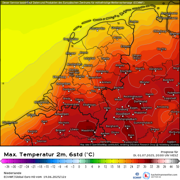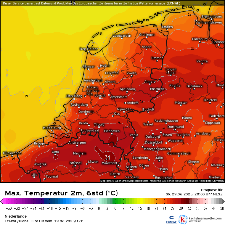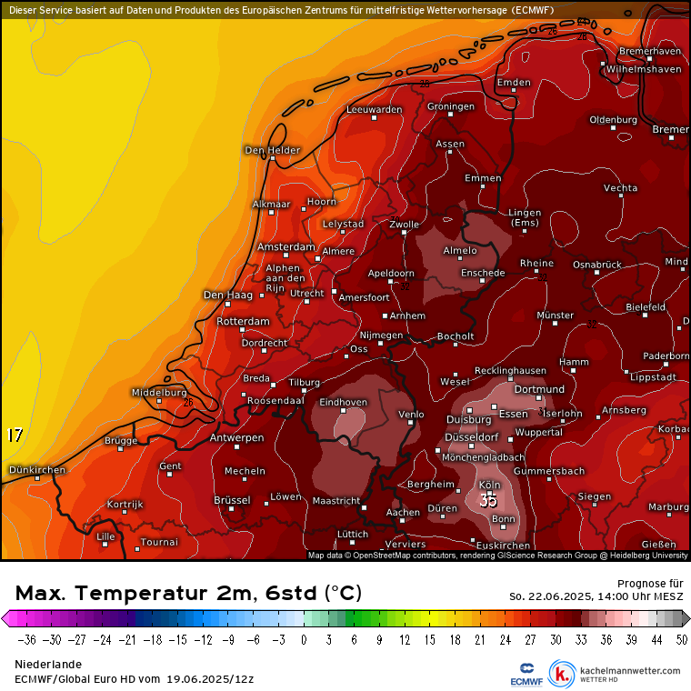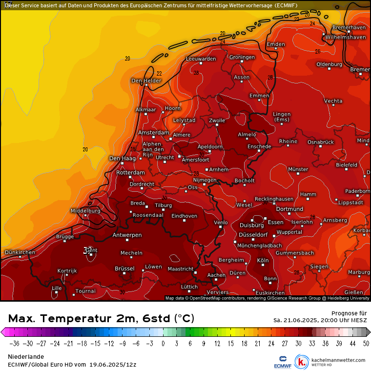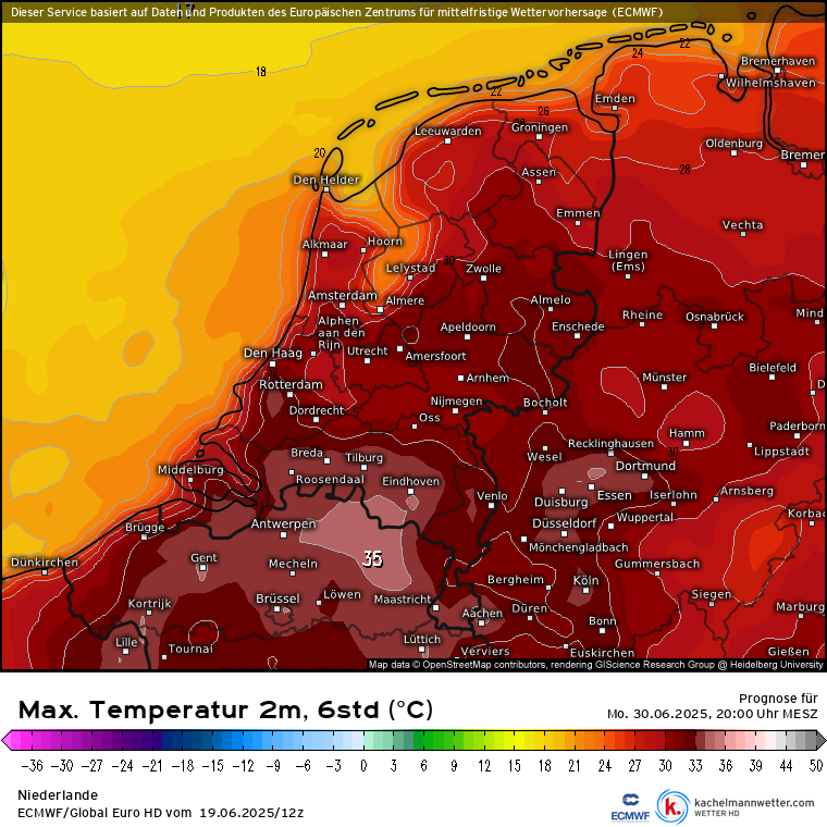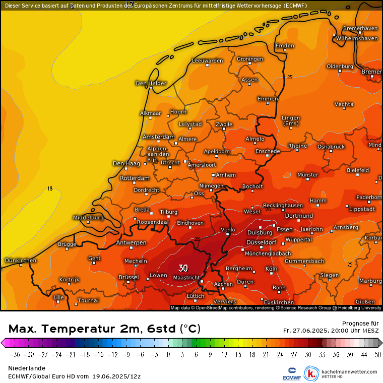 Tussendoor veelal blijvend zomers en anders nog altijd boven het klimatologisch gemiddelde voor de maximumtemperaturen. Noordwestelijke helft en zeker de kustgebieden van de Benelux bij aanlandige wind wat koeler dan het binnenland.