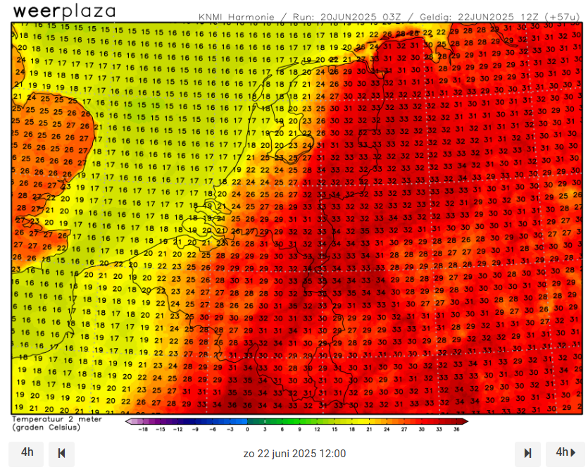 westen. Het oosten nog wat langer in de hitte. Het model voorziet zelfs wat gedruppel, maar dat stelt niks voor.