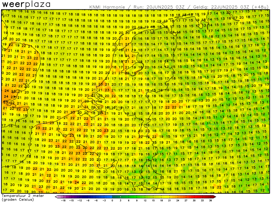 Rotterdam-Centrum volgens HARMONIE niet onder de 23 graden. Bij onze zuiderburen zelfs op grote schaal een tropennacht.