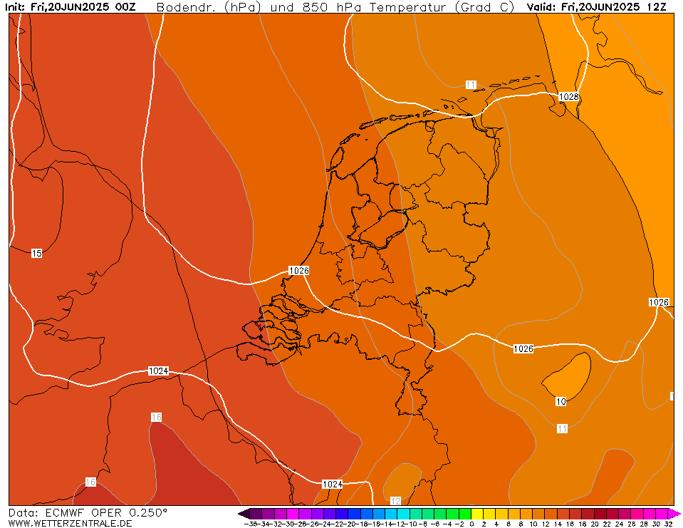 Zie hieronder de kaart van het 850hpa vlak van EC voor vandaag 14u. Logisch dus dat het daar ook het warmst is bij aflandige wind