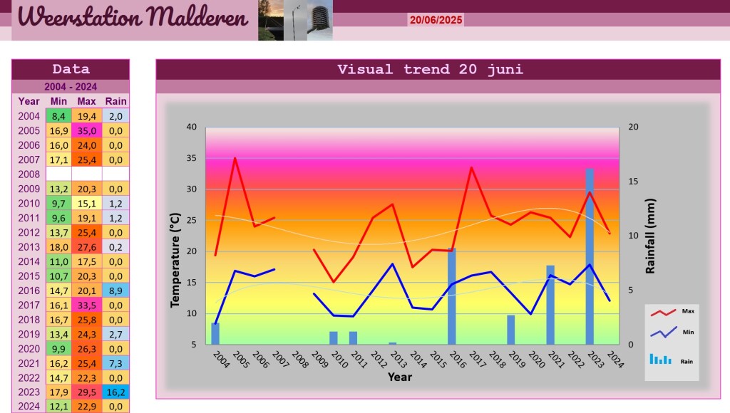 Het was vanochtend zwaarbewolkt, nevelig maar zacht bij minima van 13,7 graden. Er hing nogal wat Stratus en Stratus fractus die in de loop van de voormiddag gedeeltelijk openbrak. Daarna ging de bewolking over in Cumulus en werd het fraai zomerweer bij temperaturen die snel opliepen in de aangevoerde substropische lucht. Dit waren luchtmassa's die met snelheden tot 20,9 km/h uit het noorden over Malderen streken en daarbij opwarmden tot 25,4 graden. Na de middag verschenen er flinke stapelwolken die echter nauwelijks zichtbaar waren in de bijzonder nevelige atmosfeer die veel weg had van waterige vanillepap. De zonnestralen lichtten in de nevel op tot witachtige stralenkransen en zorgden soms voor een apart uitzicht. Tijdens de avond werd de lucht terug wat transparanter, en dit proces zette zich duidelijk in vanuit het noorden aangezien er eerst vanuit Nederland meldingen binnenkwamen van blauwer wordende luchten. Hoewel zo'n omstandigheden al eens doen denken aan het binnenstromen van polaire (koude en heldere) lucht, bleef het gewoon warm en beleefden we één van de weinige warme zomeravonden die dit jaar rijk/arm was. Af en toe dreef er Altocumulus of Stratocumulus castellanus voorbij en deze is alweer de voorbode van het volgende koufront dat de nog maar amper ontkiemde zomer weer met de grond zal gelijk maken. Voorlopig is het wel droge grond met een dagtotaal van 0,0 mm maar volgens de satellietbeelden zal dit snel veranderen...