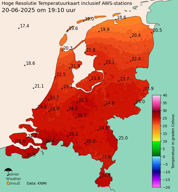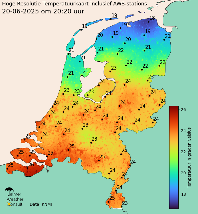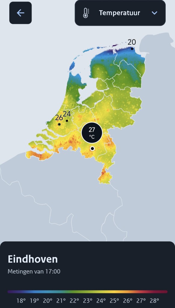 Al sinds het begin zijn de hoge-resolutie temperatuurkaarten van het KNMI te zien op m'n site. Echter, bij nader inzien en door inspiratie afkomstig van de KNMI app (zie screenshot onderaan), heb ik besloten ook geen gebruik meer te maken van een vaste kleurenschaal (van -20°C tot +40°C), maar een variabele schaal. Op die manier komen de tegenstellingen tussen de steden en het open landschap een stuk beter naar voren. Verder worden niet meer de AWS-waarnemingen getoond, die zijn op veel andere plekken al te vinden, maar in plaats daarvan de (geschatte) temperatuur in enkele tientallen plaatsen/steden.