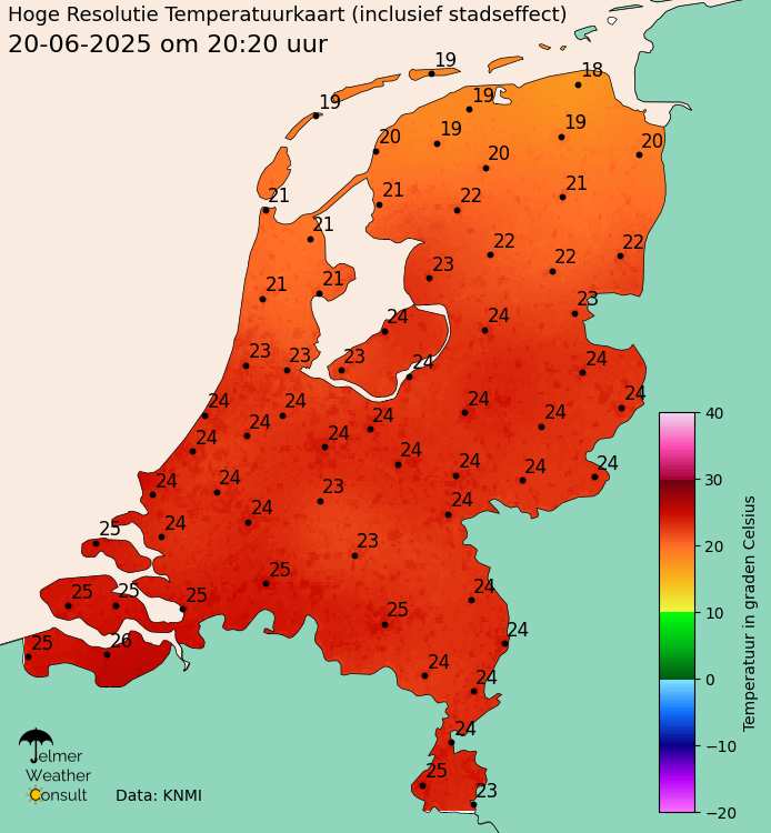 Op de verschillen tussen stedelijk en niet-stedelijk gebied, iets wat juist de meerwaarde is t.o.v. kaarten van bijvoorbeeld Weerplaza. Zie de vergelijking hieronder. Maar goed, de meerderheid hier lijkt voorkeur te hebben voor een vaste schaalverdeling. Misschien heb ik te veel lessen over stadsklimaten gevolgd.