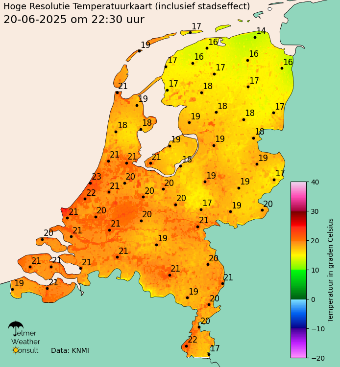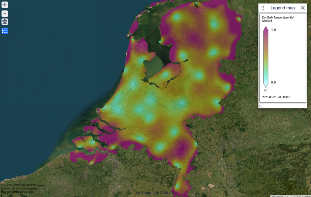 Decimalen heb ik expres niet voor gekozen, omdat het niet puur metingen zijn, maar berekende waarden o.b.v. AWS- en PWS-stations, en landeigenschappen. Zeker in de gebieden die wat verder van een officieel AWS af liggen is de onzekerheid (standaarddeviatie) al snel een halve graad.