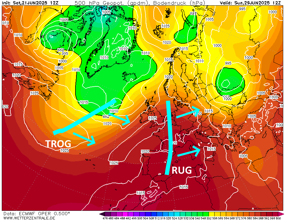 Dat levert vanzelf weer tropische dagen op. Dan is het de vraag of we hetzelfde patroon krijgen als de komende dagen: de rug wordt weggeduwd, Oceaan neemt in bescheiden vorm over. Denk dat we het nog wel mee gaan maken dat de continentale rug in juli/augustus blijft liggen met een uitzakkende hoogtetrog richting Biskaje. Dan zijn de rapen gaar.
