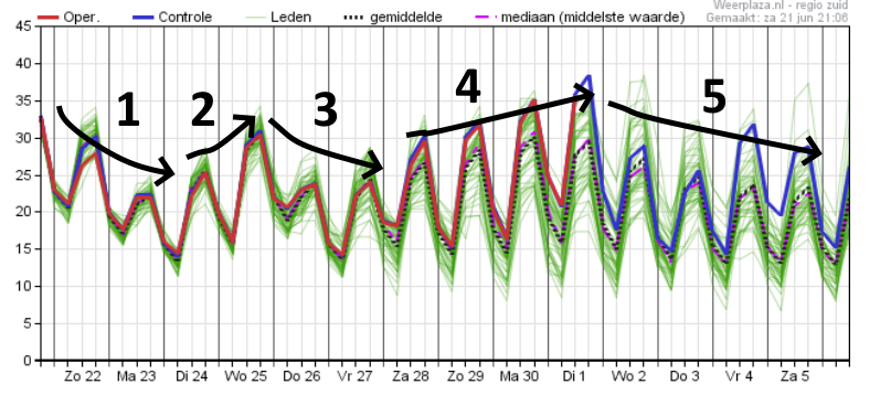 4) Rug vanuit Zuid-Europa richting ons, trekt geleidelijk oostwaarts door. Steeds warmer.