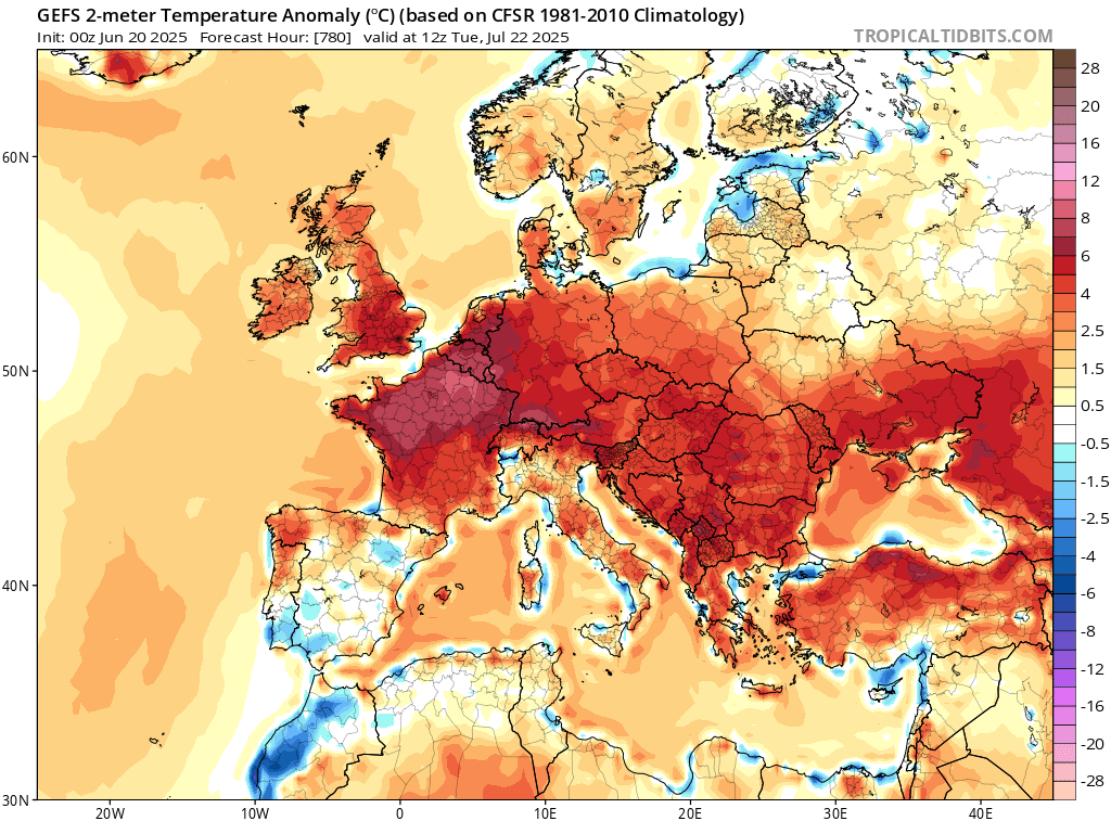 Bijgaand ook nog een anomaliekaart van TropicalTidbits geldig voor het ensemblegemiddelde aan het einde van de periode.