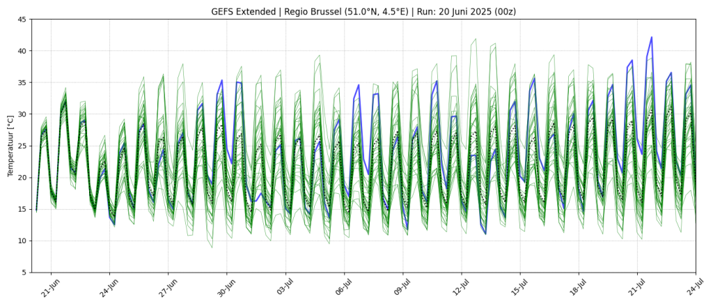Bekijk je alle runs individueel, kom je uit op gemiddeld 24 zomerse dagen, 11 tropische dagen en 2 extreem warme dagen (35+) tot en met 23 juli.