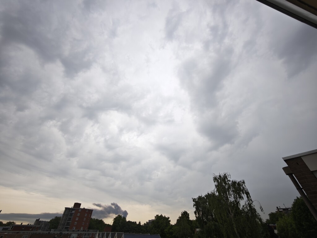 Hier in de verte gerommel en werking in de lucht, inclusief een vreemde wolk erbij, de eerste druppels vallen nu
