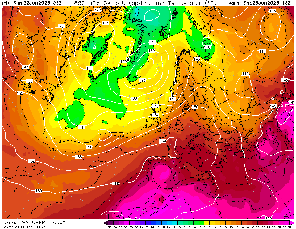 Hierdoor volgens GFS06Z-oper voorlopig nog geen doorbraak van een koeler en wisselvalliger weertype. Vooral België op termijn weer richting de 30 graden ...