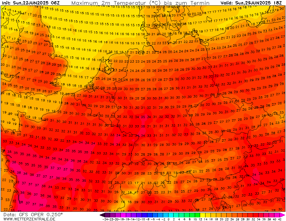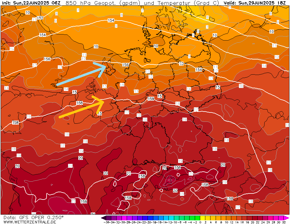 Ook in deze run bevinden we ons op de grens tussen continentale hitte en oceaankoelte, waarbij de temperatuurverschillen in de Benelux op sommige dagen nogal groot kunnen zijn. In grote lijnen waait de wind in Nederland in dit scenario direct vanaf zee, terwijl de lucht in België eerst een flink eind land (Frankrijk) heeft gepasseerd.