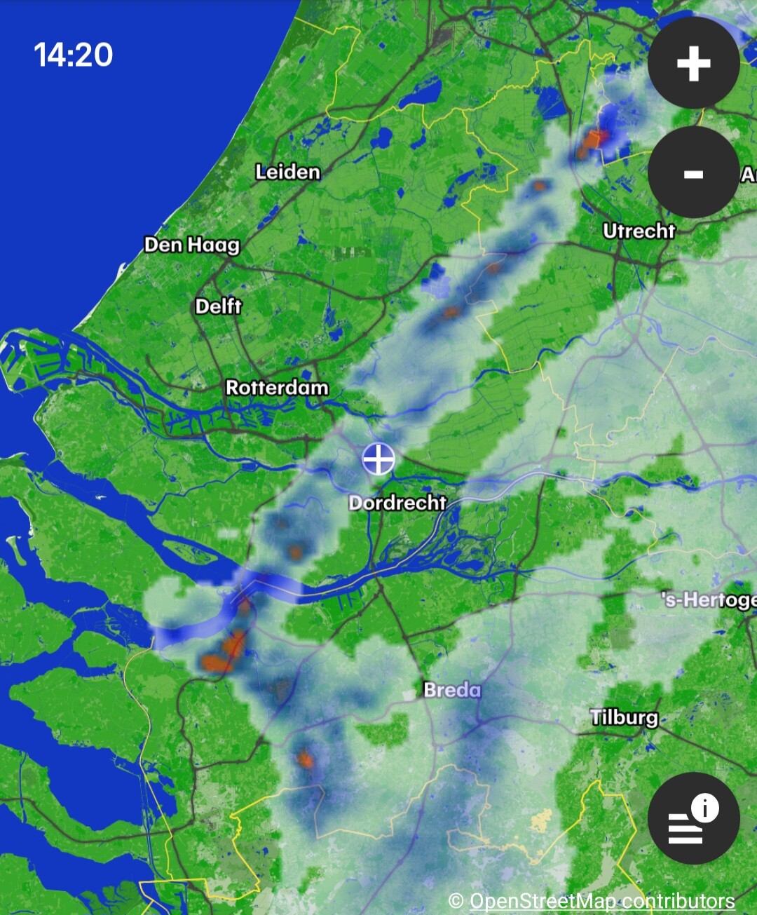 Ik lig hier onder een buienlijntje dat in de lengterichting overtrekt maar stelt tot nu toe niet veel voor.