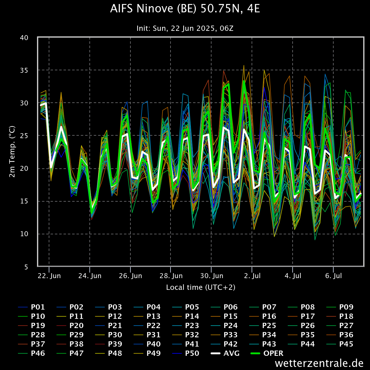 Als aanvulling op jouw post, het volledig ensemble van AIFS, waarbij we zien dat de oper bovenin zit rond 30/06 en 1 juli. Nu we het ENS ook ter beschikking hebben op WZ, kunnen we deze ook toevoegen als aanvulling op de bespreking van de oper AIFS.