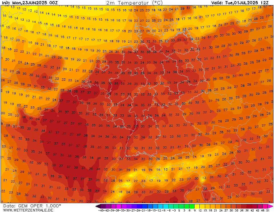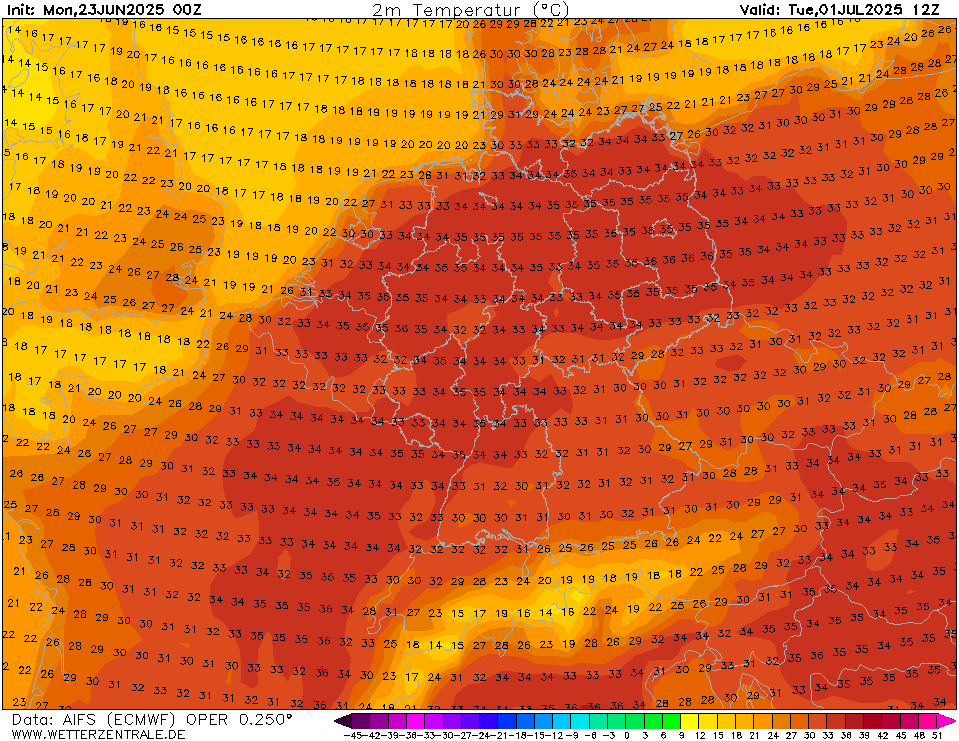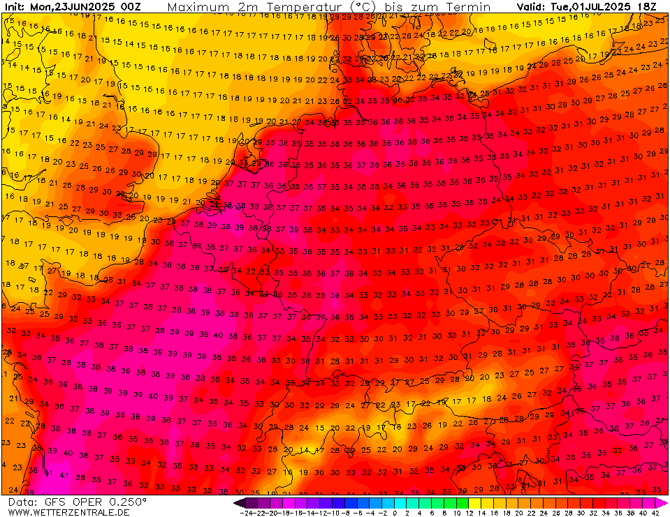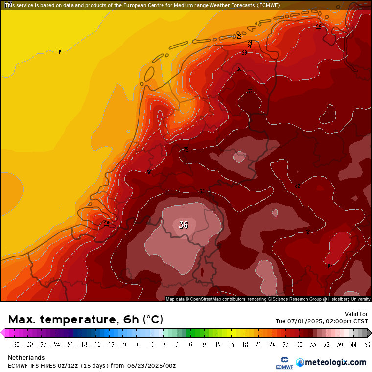 De meeste laten vanaf zaterdag in het zuiden van de Benelux (alweer) tropische temperaturen zien, gevolgd door twee of drie dagen met op grote schaal tropische warmte. Uiteindelijk op dinsdag 1 juli volgens alle operationele runs vanochtend (ECMWF, GFS, GEM en AIFS) een piek met temperaturen ergens tussen de 31 en 39 graden.