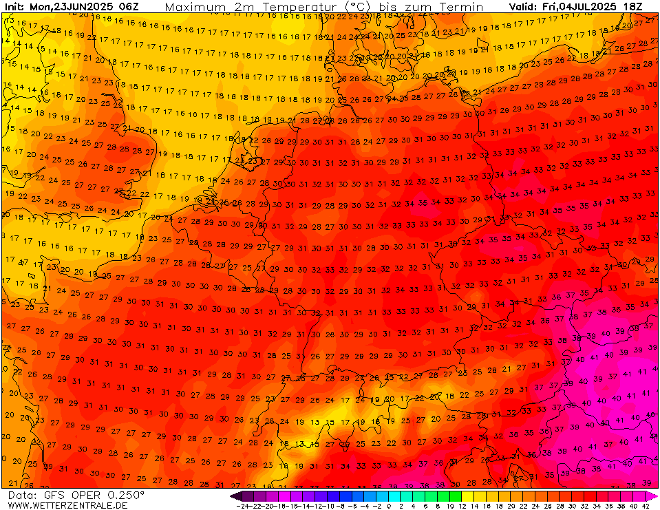 1 juli tussen 31 en 37 graden in de Benelux, westen van Frankrijk 40+