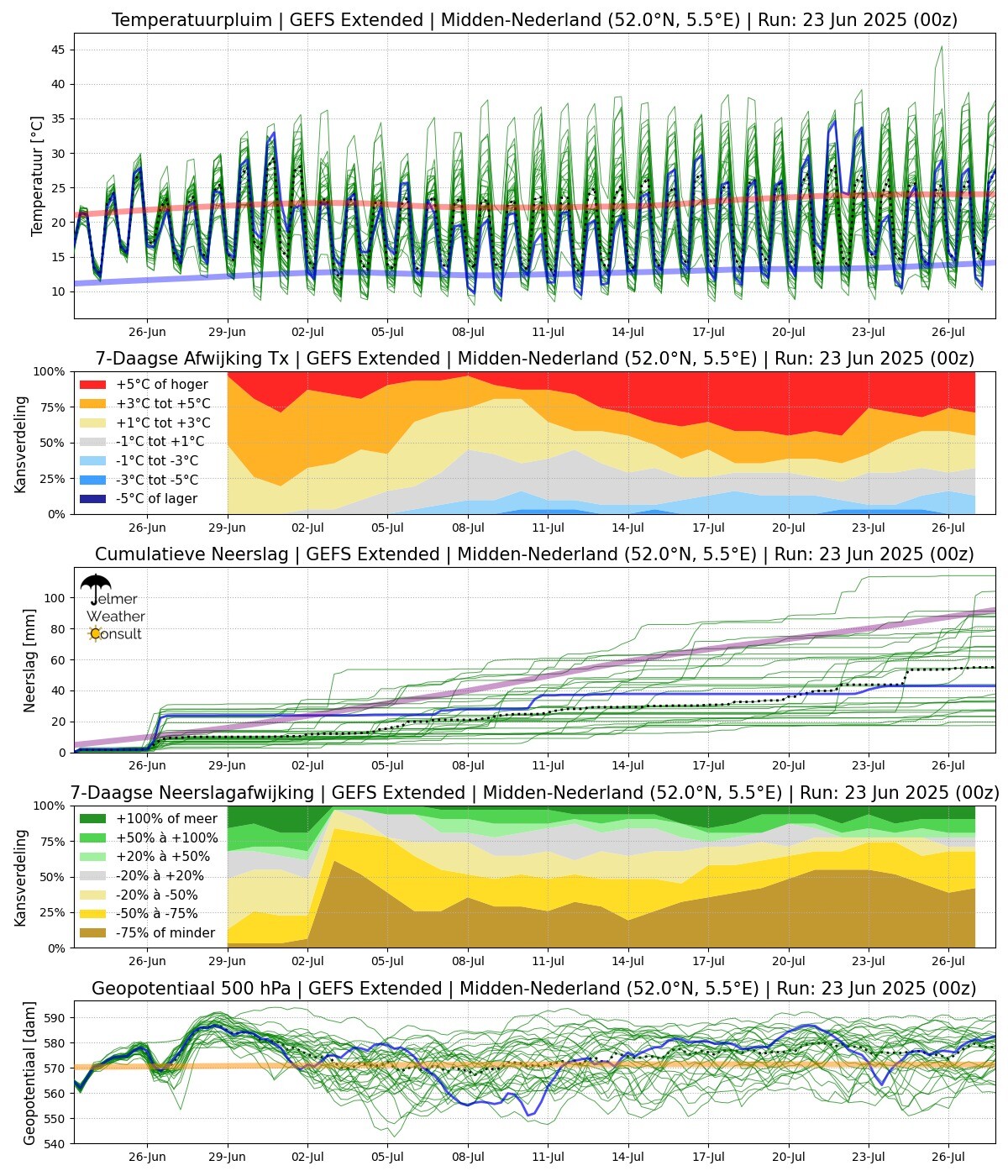 De controle-run is dit keer redelijk gematigd en ligt vaak rond of onder het ensemblegemiddelde, maar heeft voor de komende 35 dagen alsnog een vrij hoog aantal zomerse (18 tegen ~9 normaal) en tropische dagen (5 tegen ~2 normaal).