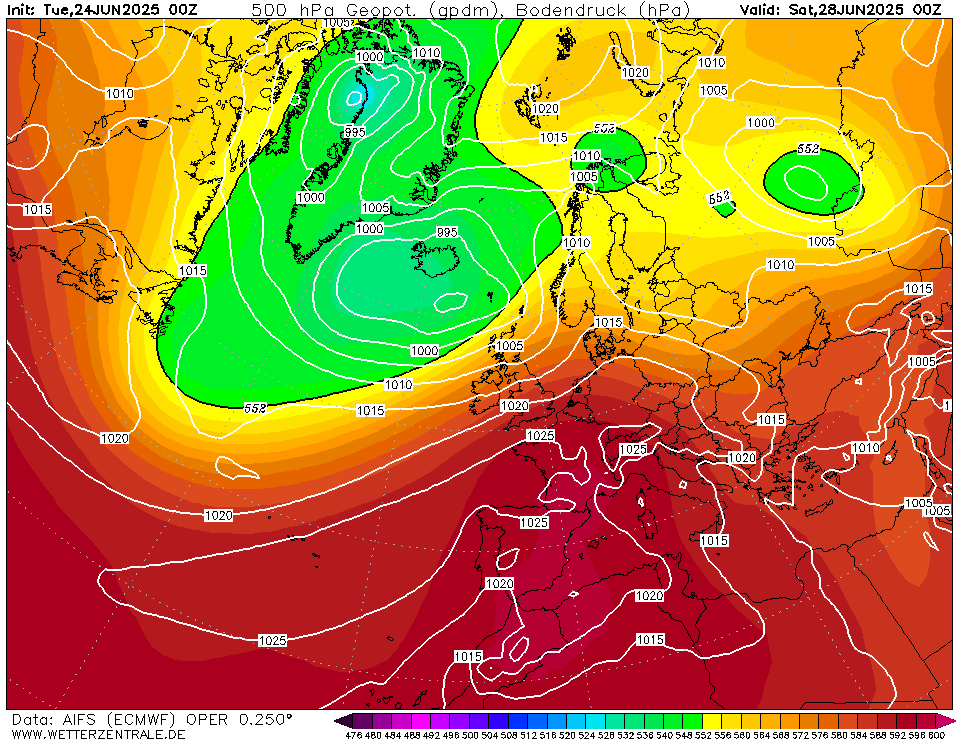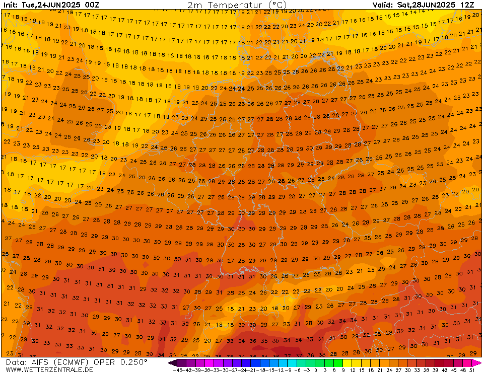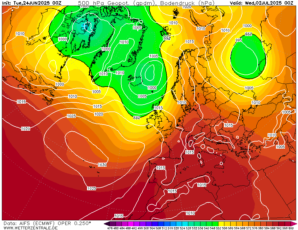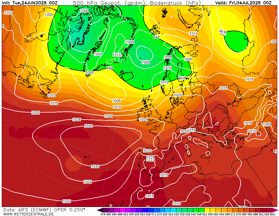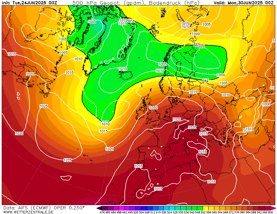 We zien dat de hogedruk zich langzaam weer naar het noorden uitbreidt. Hierdoor komen de hoge temperaturen de komende tijd ook weer terug. Vooral 29 en 30 juni en 1 juli lijken er uit te springen met vaak tropische temperaturen. (temperaturen zijn van 12Z, dus daar kun je nog een paar graden bij optellen)