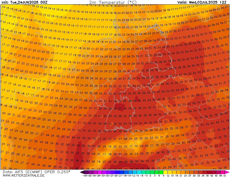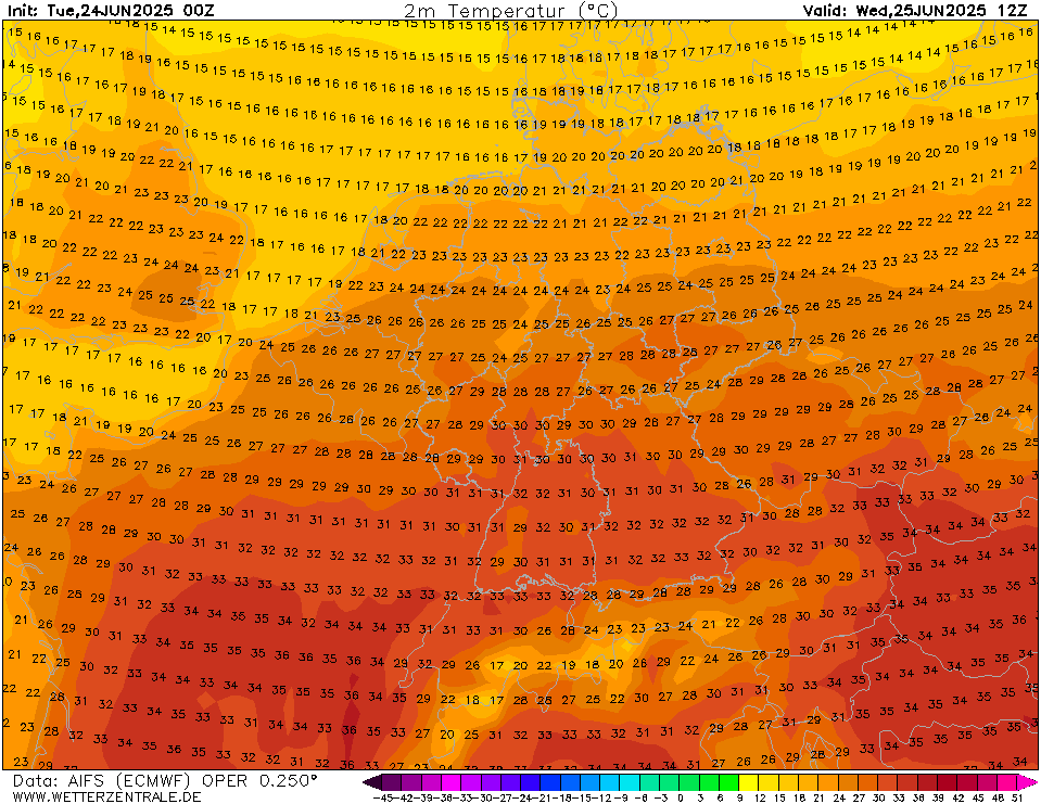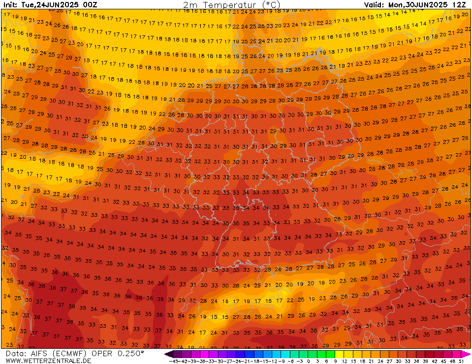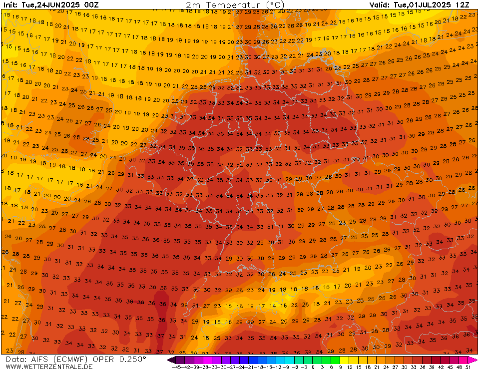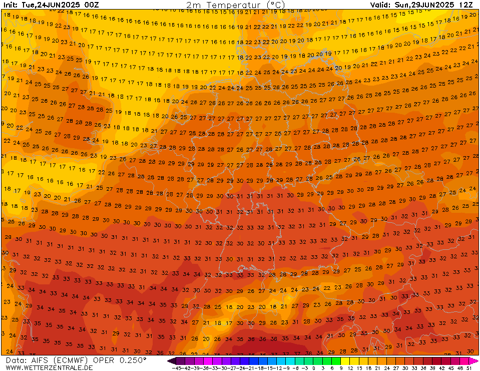 We zien dat de hogedruk zich langzaam weer naar het noorden uitbreidt. Hierdoor komen de hoge temperaturen de komende tijd ook weer terug. Vooral 29 en 30 juni en 1 juli lijken er uit te springen met vaak tropische temperaturen. (temperaturen zijn van 12Z, dus daar kun je nog een paar graden bij optellen)
