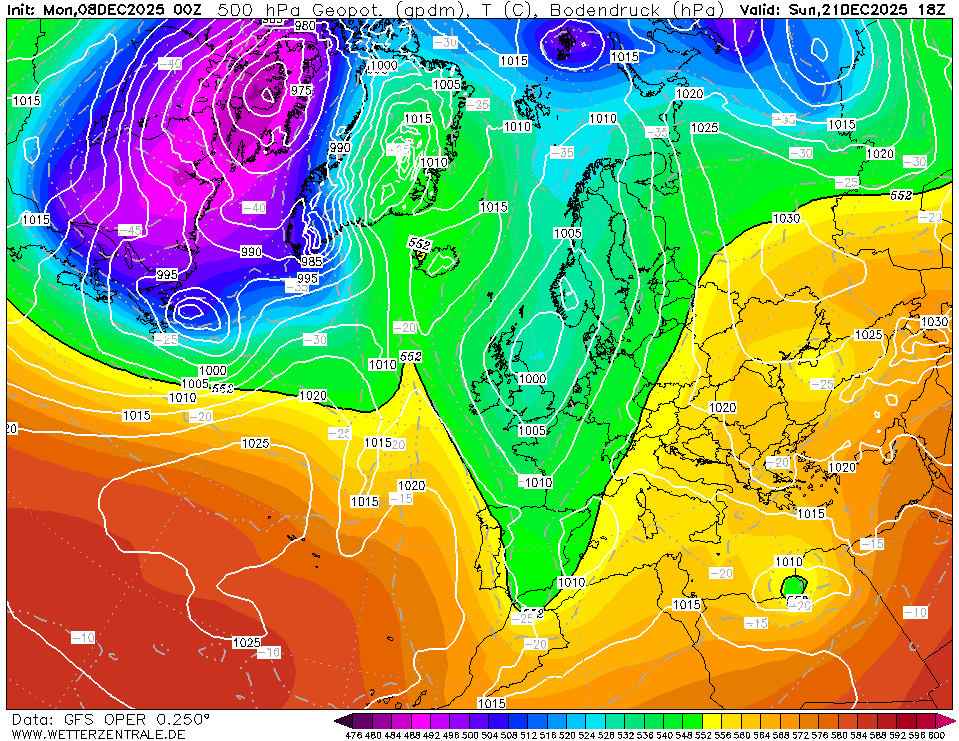 Wat me zelf opvalt op de weerkaarten, is dat de groene kleuren boven het noorden geleidelijk afnemen. Dit wijst op een stijging van het 500 hPa-niveau, oftewel: de hoogte waarop de luchtdruk 500 hPa bedraagt komt hoger te liggen. Dat is een teken dat de luchtkolom daar opwarmt en de invloed van koude lucht op hoogte afneemt.