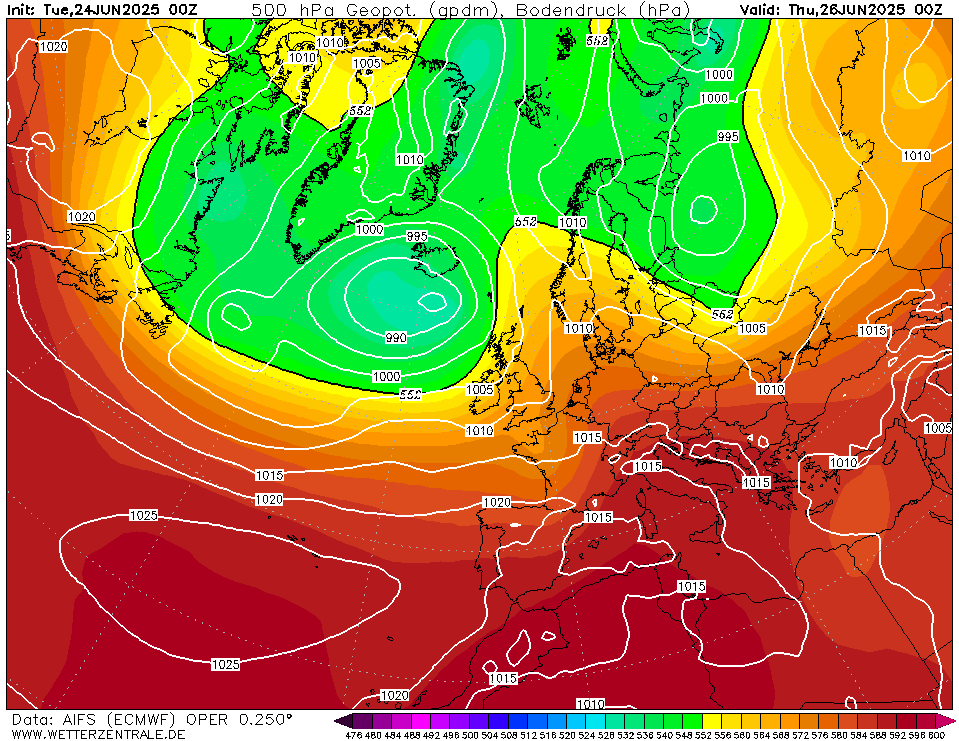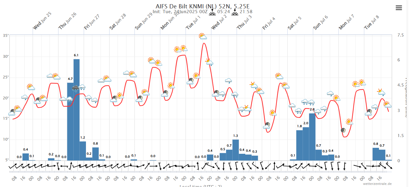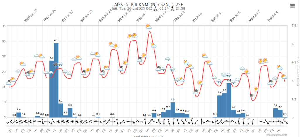We zien dat de hogedruk zich langzaam weer naar het noorden uitbreidt. Hierdoor komen de hoge temperaturen de komende tijd ook weer terug. Vooral 29 en 30 juni en 1 juli lijken er uit te springen met vaak tropische temperaturen. (temperaturen zijn van 12Z, dus daar kun je nog een paar graden bij optellen)