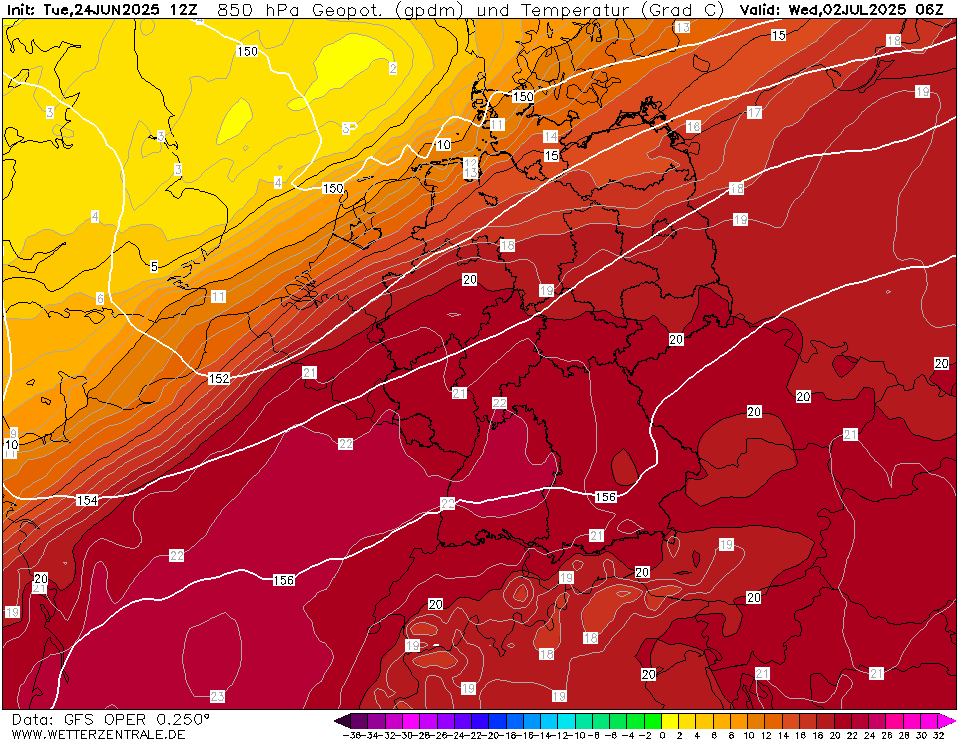 T850 variërend tussen 8 graden op Texel en 22 (!) graden in Luxemburg: