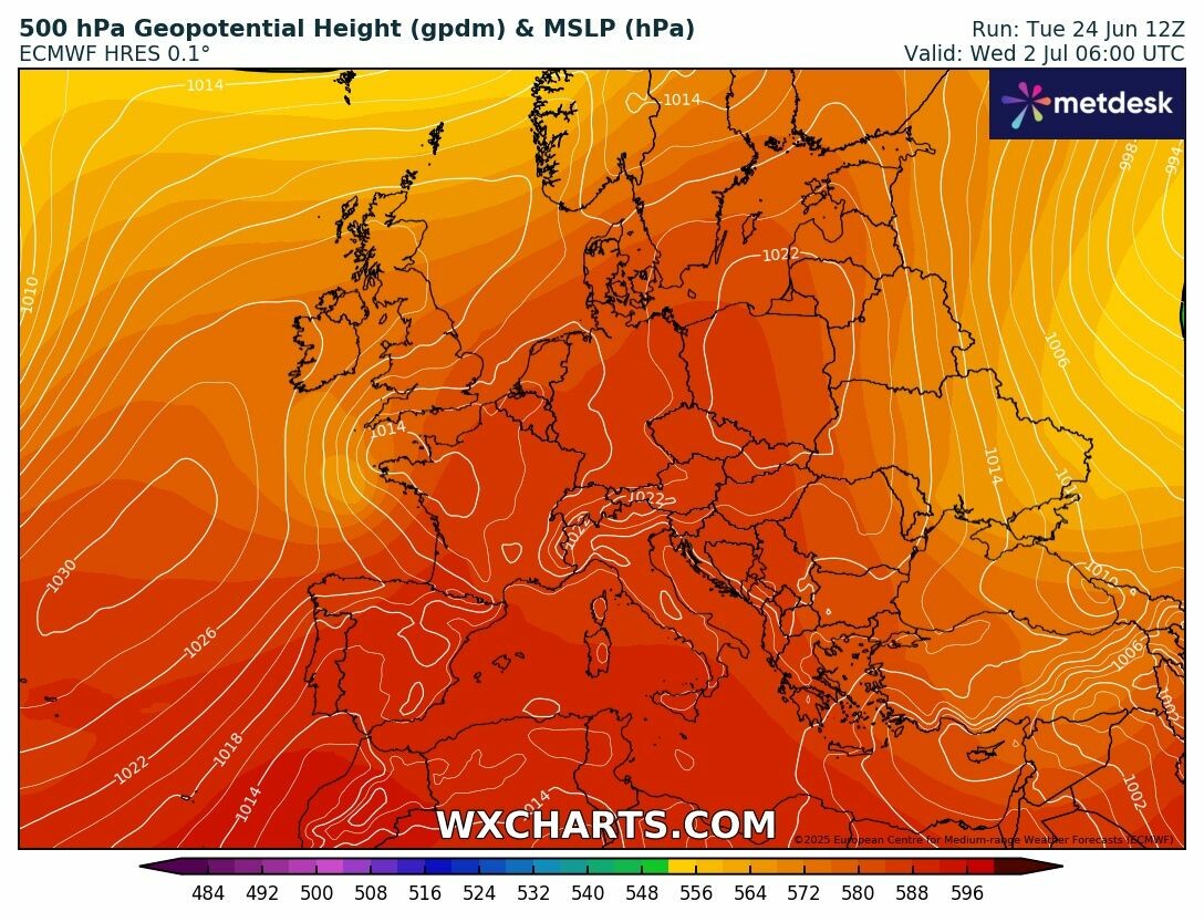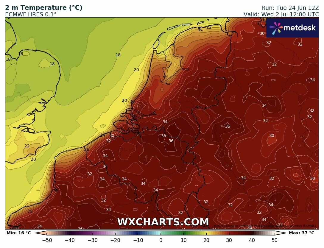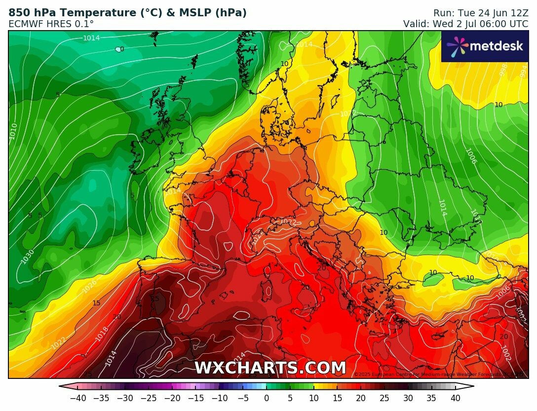 Hogedruk lijkt zich hier af te splitsen vanaf het Azorenhoog en reikt ten noorden van ons, waardoor de warme lucht aangevoerd door een zuidstroming langer blijft 'plakken', met een over het algemeen aflandige wind. GFS komt ongeveer ook met zoiets. Het is maar één oper. en nog ver weg dus nog onzeker.
