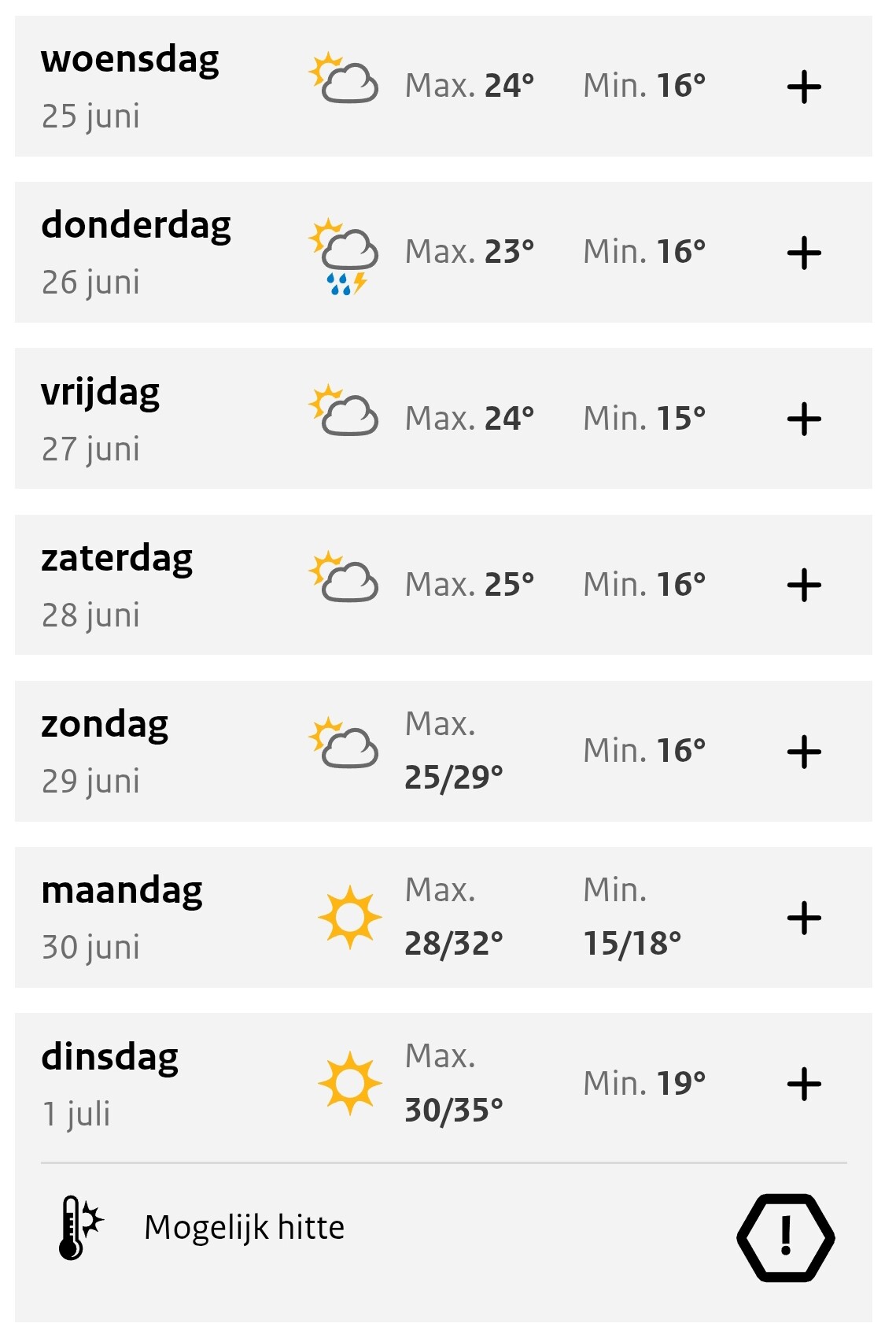 "Dinsdag mogelijk gevaarlijk weer: hitte. Mogelijk extreem warm met landinwaarts middagtemperaturen rond 35°C."