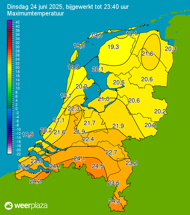 Wat gisteren ook wel meespeelde is dat de maxima pas erg laat werden bereikt, in o.a. Deelen pas om 20:20 uur. Uiteindelijk bijna overal 20 - 24 graden met in Eindhoven zelfs een afgeronde 25'er. Daardoor viel het midden op de dag erg tegen t.o.v. de verwachting qua temperatuur, maar gisterenavond was het inderdaad wel lang warm.