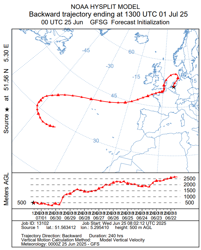 De NWP-modellen tonen veelal een zeer warme luchtmassa, tot wel 18-21°C op 850 hPa, waarvan lijkt dat die vanuit het zuiden van Europa op transport gaat naar de Benelux. De oorzaak van de potentiële hete luchtmassa is echter wat subtieler. Er wordt weinig temperatuursadvectie berekend door de NWP-modellen richting de Benelux, daarnaast toont het HYSPLIT air trajectorymodel (GFS-based run) dat de hete luchtmassa zijn oorsprong vindt boven de Atlantische Oceaan. Daardoor lijkt het erop dat de luchtmassa opwarmt door subsidentie onder anticyclonale invloeden. Dit is atypisch voor een zeer hete situatie want normaliter gaat de hete luchtmassa op 'transport' vanuit het zuiden van Europa naar de Benelux. Hiermee is deze vorm van opwarming vergelijkbaar met het thermische event van bijna twee weken geleden.