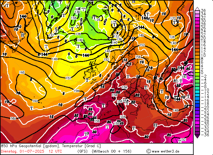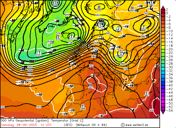 Novi, bedankt voor je uitgebreide analyse. Subsidentie en felle zon kunnen flinke hitte veroorzaken. Warme lucht heeft echter de neiging om te stijgen maar met krachtige hogedruk kan dat worden tegengegaan ('heatdome'). De hitte kan zich dan alleen horizontaal uitbreiden. Een graadmeter voor de kracht van het hogedrukgebied is de geopotentiële hoogte van 500-hPa. Deze wordt voor a.s. weekeinde op 5,9 km berekend en dat is uitzonderlijk hoog voor Nederland. Ook in o.a. juli 2019 en september 2023 (maar toen al later in het jaar) kwam het 500-hPa vlak op die hoogte terecht. Vroeger kwam het nooit zo hoog.