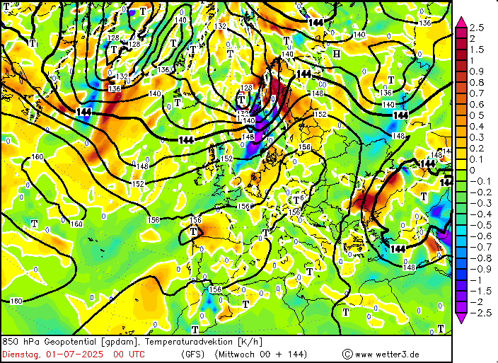 Overigens wil ik wel zeggen dat op het moment van jou analyse (1 juli 12:00UTC) de heetste lucht al is verdreven. De nieuwe GFS-run is hier nog sneller in. Wat is het brongebied als je een eerder moment neemt? Voor 1 juli 0:00 UTC wordt nog wel veel warmte-advectie berekend.