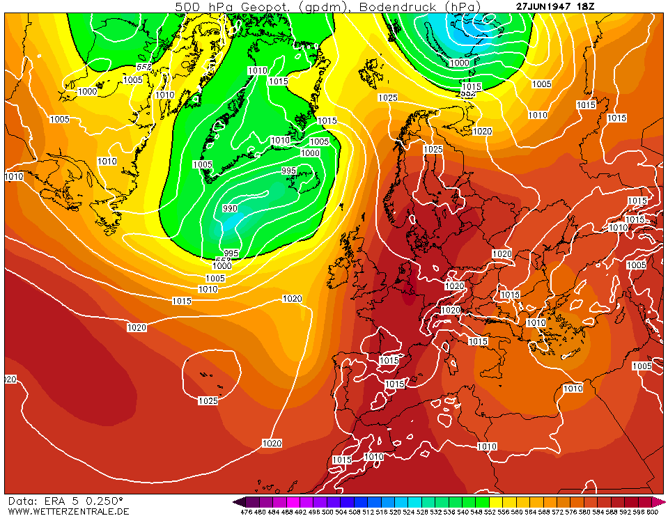 Een vergelijkbare set-up uit het verleden als de huidige berekende situatie lijkt mij uit de losse pols, synoptisch gezien, overigens 27 juni 1947. Toen was er een geopotentiële hoogte van 5.92-5.96 km op basis van de ERA5-reanalyse, en in grote lijnen was de synoptische situatie wel vergelijkbaar, maar lag de anticycloon wat beter gepositioneerd boven West-Europa. T850 was toen stukje hoger boven de Benelux. Overigens heb ik geen data over in hoeverre warmte-advectie toen een rol heeft gespeeld, maar dat was wel een van de meest bijzondere hitte-opstoten van de 20ste eeuw. Was een van de weinige voorbeelden uit het verleden waarbij het 'heat-dome effect' (zeer) waarschijnlijk een rol van betekenis heeft gespeeld.