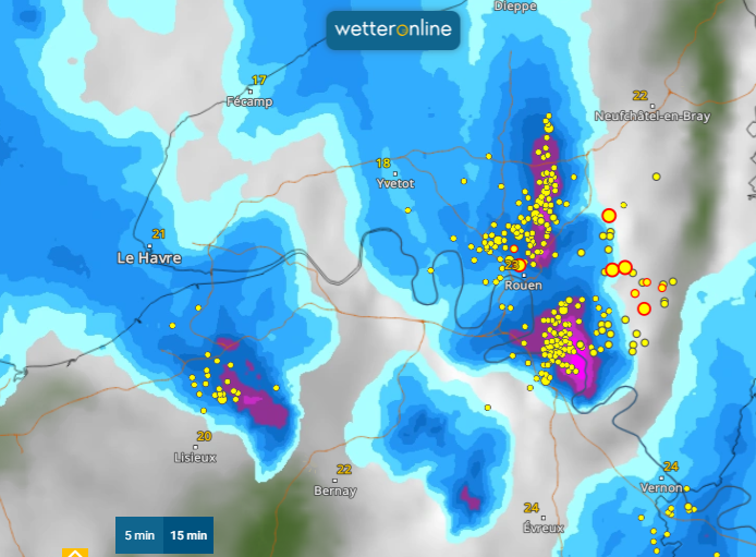 Latest radar data reveals at least two dominant right moving supercells, which produce severe gusts and large to very large hail. These storms ride along the warm side of the baroclinic sea breeze front in an environment with abundant shear and roughly 1500 J/kg MUCAPE. This CAPE shear space exists for the next 1-2 hours before CIN increases. Merging of both cells into a severe bow is not ruled out but this is not reflected in latest NWP data. In addition, destructive interaction with a cluster near Paris is possible. Nevertheless an ongoing severe to extreme gust/hail risk exists in the near term especially for Rouen down to Val-de-Reuil. These are high impact thunderstorms!