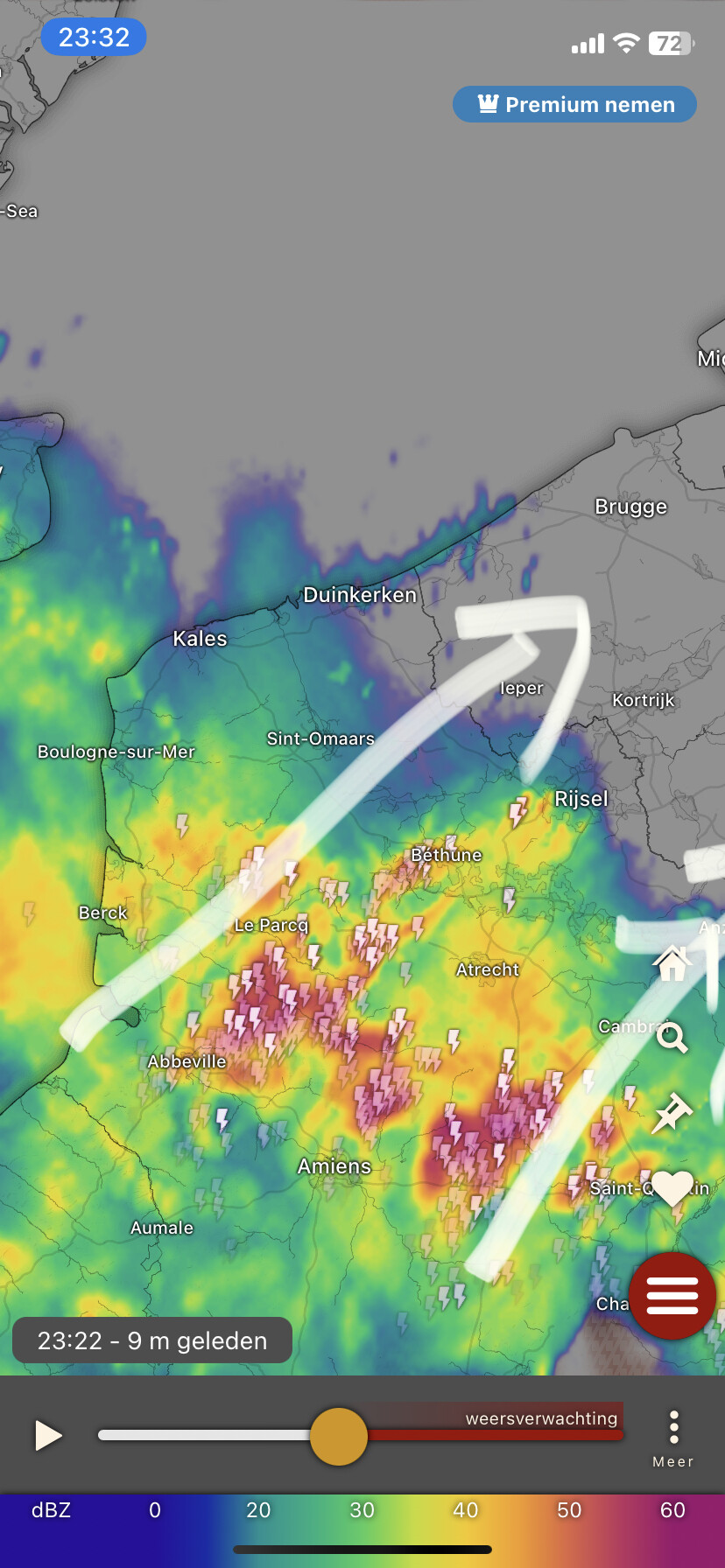 Ik zie toch een andere radar… de onweders en hevige regen liggen allemaal op koers ten oosten van hier hoor. Hier niet teveel zo te zien