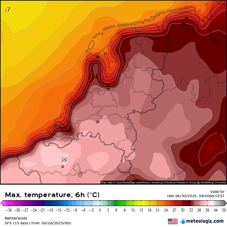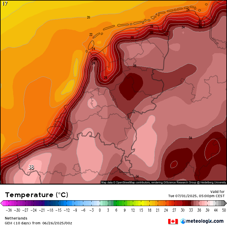 GEM laat temperaturen zien van 33-38°C op dinsdag