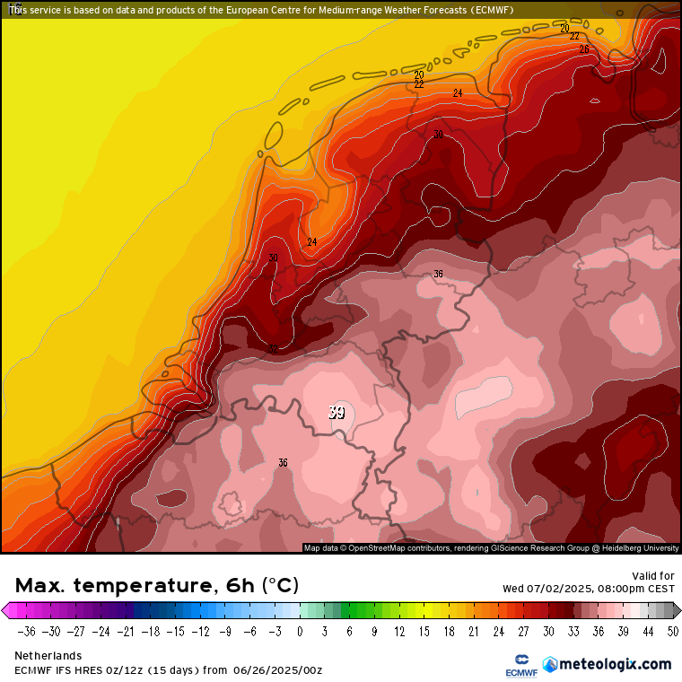 ECMWF laat op woensdag plaatselijk maxima zien van 39°C, maar op dinsdag overal tropisch met 32-37°C