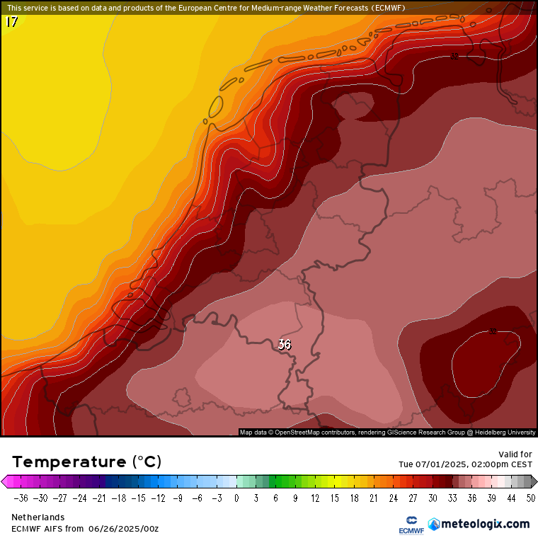 AIFS laat waarden zien voor 12 UTC, dus op dinsdag waarschijnlijk maxima van 33-38°C