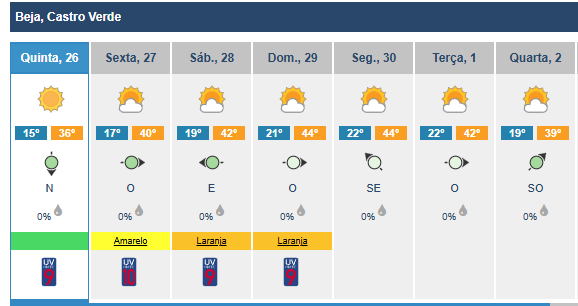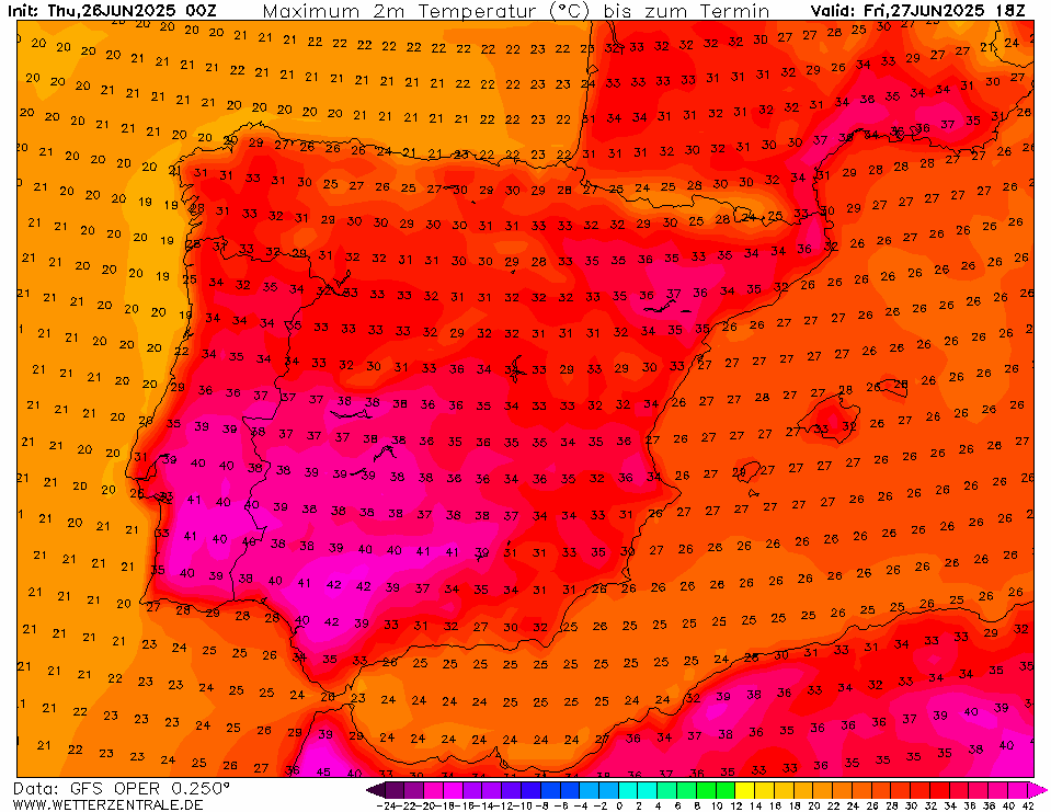 Deze waarden zien we bij GFS echter vaker naar voren komen, en telkens lijkt het een overschatting van meerdere graden. De Portugese weerdienst houdt het op 44 graden. Ook in Lissabon zou het zondag 43 graden worden. Kan mij niet heugen een dergelijke reeks ooit eerder te hebben gezien in juni. De recordcijfers van het Spaanse Cordoba bevestigen dat beeld.