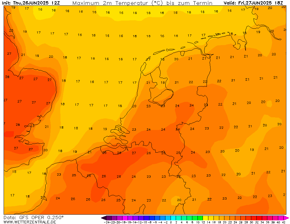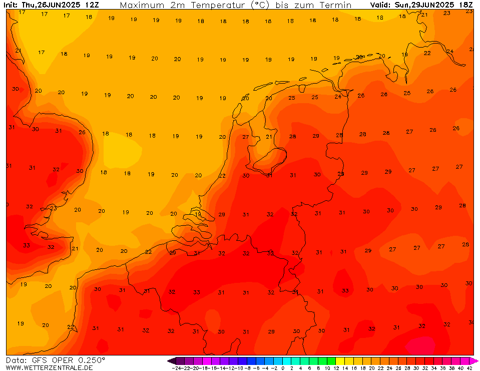 Op 1 juli wordt om 14:00 uur een T verwacht van 32,5 °C