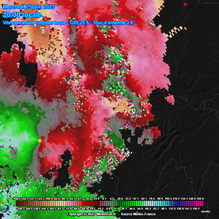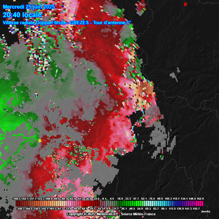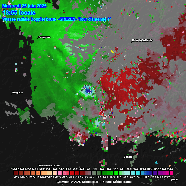 Ten oosten van Limoges zijn windsnelheden van 150 km/h te zien op enige hoogte (zie 2e animatie). Het schadespoor begon tussen Bordeaux en Toulouse en dat is ook precies het moment waarop de Doppler radar hoge windsnelheden begon waar te nemen (> 100 km/h, 3e animatie). Het spoor eindigt 700 km verderop in Luxemburg.