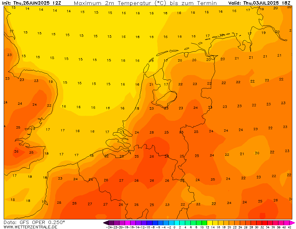 Op 1 juli wordt om 14:00 uur een T verwacht van 32,5 °C