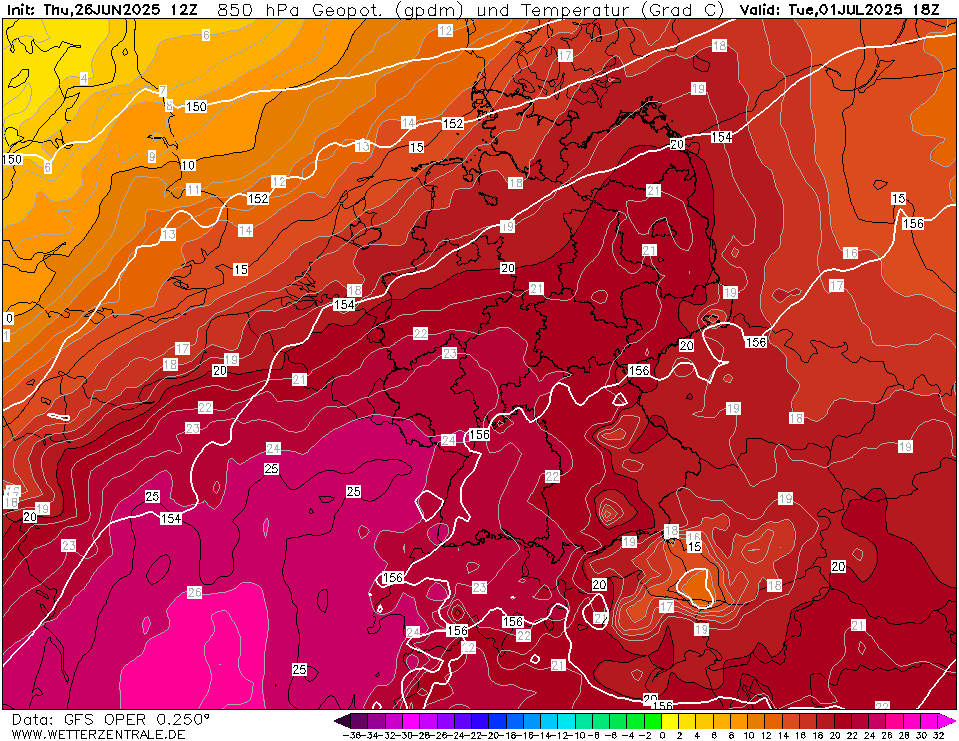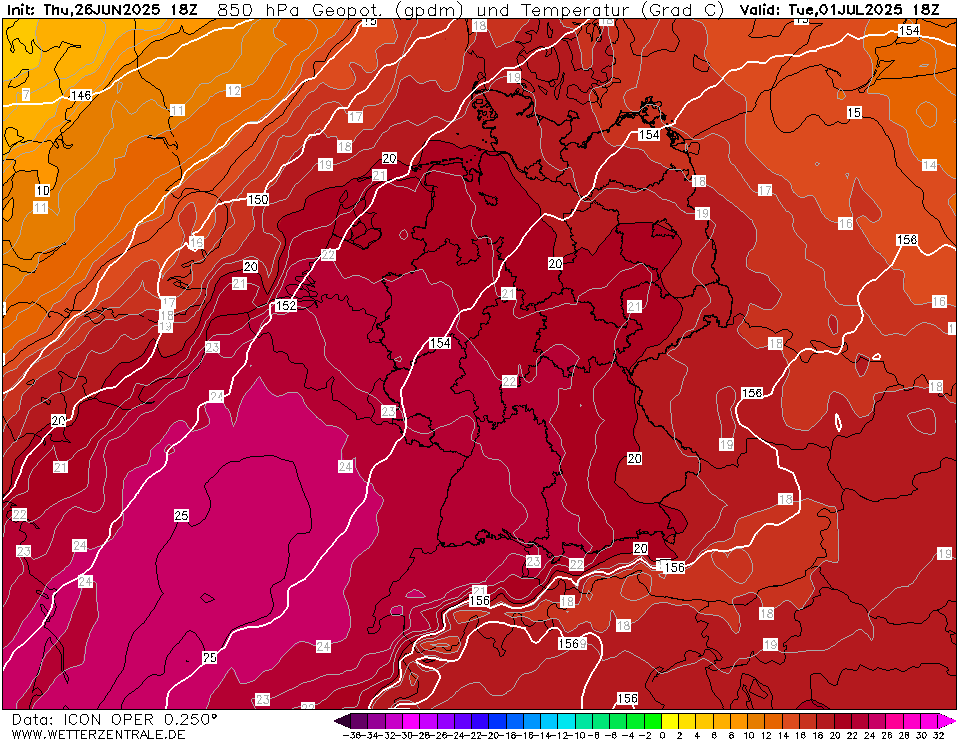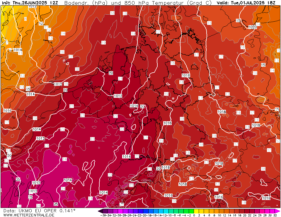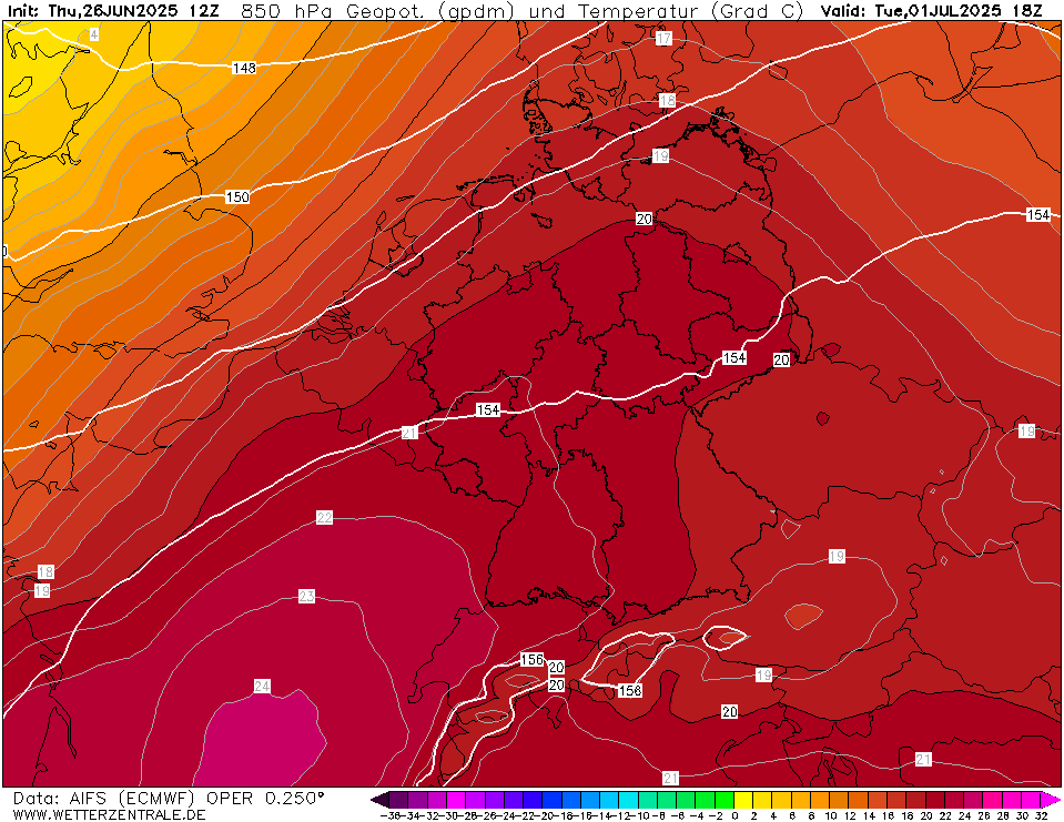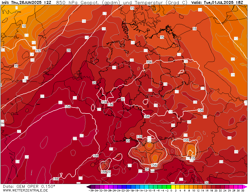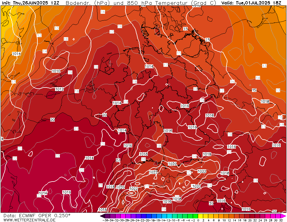 22°C tegenover 19-20°C. Nog niet heel waarschijnlijk. Een nieuw decaderecord (35°C 'nodig') lijkt een wat grotere kans van slagen te hebben, maar is nog geen zekerheid.
