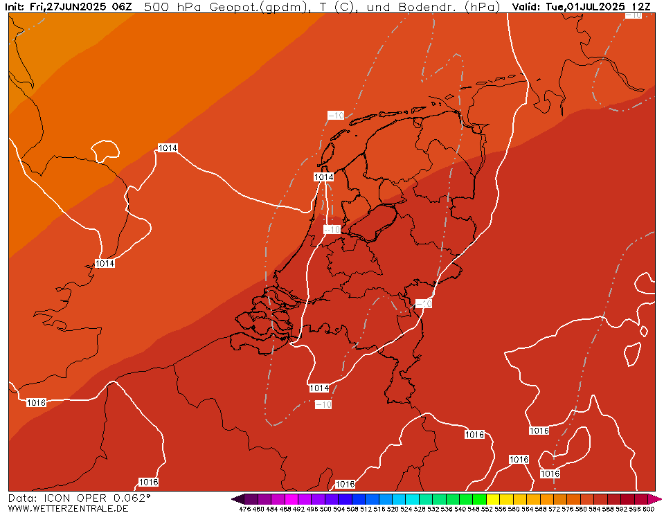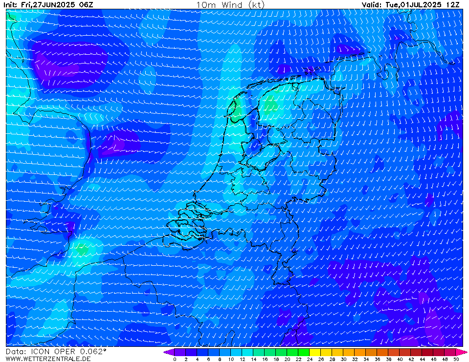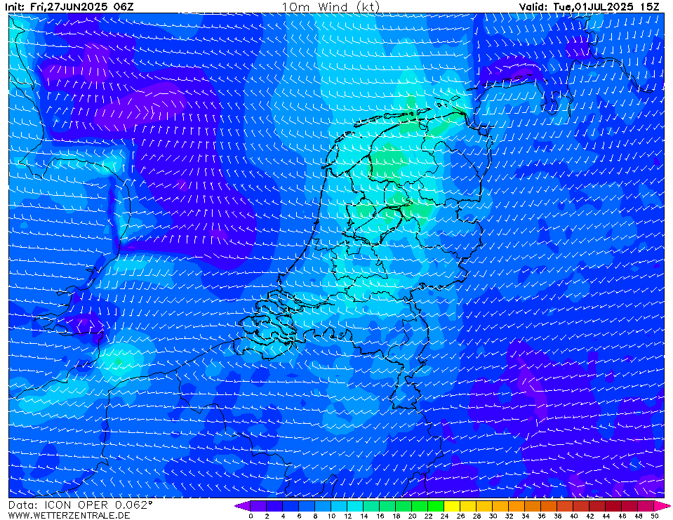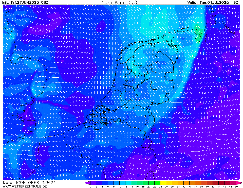 Daarachter draaiing van de wind naar west, later noordwest. Enige versterking door het ontstaan van een zeewindcirculatie zou ook nog kunnen optreden. De stroming blijft echter zwak, dus "koud" zal het niet worden aan zee. Zeker niet in combinatie met de zeer warme bovenlucht en menging.