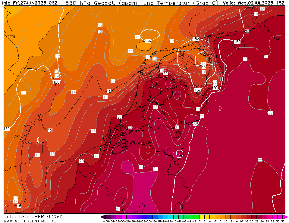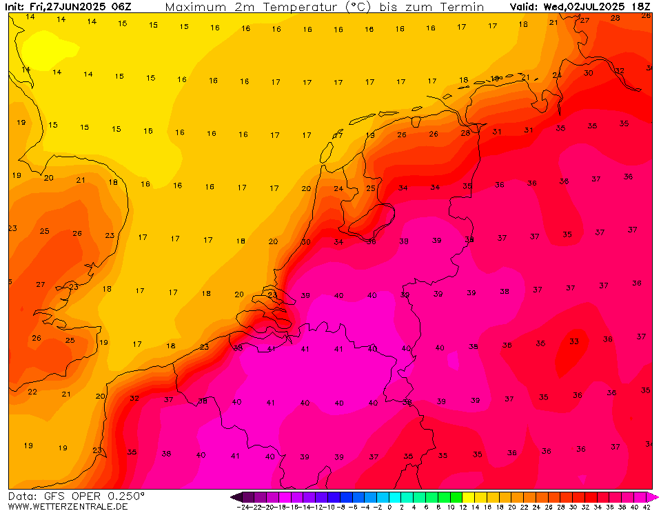 Tx / Tn overzicht (06z GFS oper, 27 juni 2025), hittegolf in de maak?