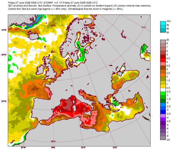 Die al dagen zeer aanwezig is met kracht 4 tot 6 en vlagen van 40-65 km/u. Wat verder opvalt is de relatief hoge temperatuur ondanks het herfstige weertype, niet gek gezien de afwijking van de SST, die in het Middelandse Zeegebied overigens nu alweer rond de augustusnorm ligt.