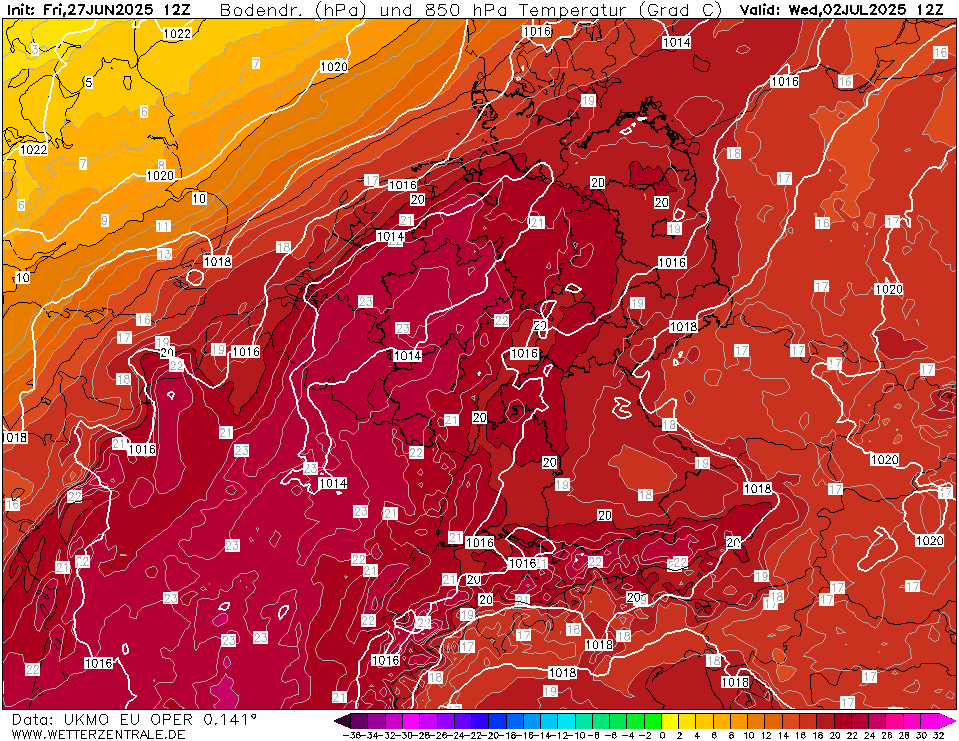 Even selectief de warmste kaart van de gehele run eruit gevist, maar de T850 reikt volgens deze run tot 23 graden in België en het zuidoosten van Nederland. Tja, dan zou je op grondniveau lokaal toch aardig dicht in de buurt van de 40-gradengrens uitkomen. Vanaf de nacht naar donderdag stroomt minder warme lucht binnen vanuit het noordwesten.