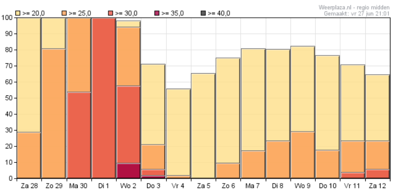 Morgen is een groot vraagteken of we de 25 °C wel halen. Dan moet de donderdag aansluiten met > 25 °C en dat lukt waarschijnlijk niet. Los daarvan moeten dan de drie tropische dagen ook nog eens lukken.